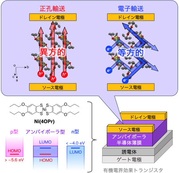 アンバイポーラ(両極性)の分子半導体を用いることで、単一材料内において正孔と電子が異なる輸送異方性を示す有機電界効果トランジスタ(OFET)を実現
